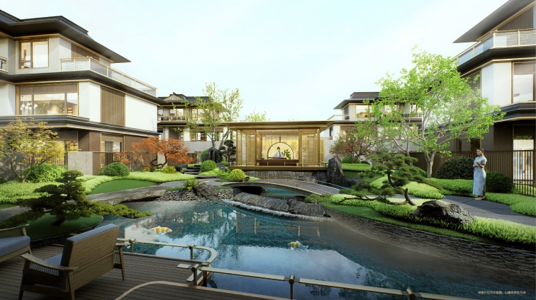 在建筑園林打造上,延續(xù)“山河”系列一脈相承的宋式美學(xué)基因,萃取《營(yíng)造法式》中經(jīng)典建筑語匯,以“落客、登門、入境、入畫、人心”五進(jìn)禮序空間,層層遞進(jìn),演繹歸家儀式感。同時(shí)遵循宋代園林“堆山、疊石、理水”的造園古法,將建筑輪廓、錯(cuò)落灌木、蜿蜒小橋與靈動(dòng)流水相融,構(gòu)建高、中、低三重立體景深層次。日常動(dòng)線仿若穿行于流動(dòng)的宋風(fēng)長(zhǎng)卷,意境悠遠(yuǎn),心歸畫中。