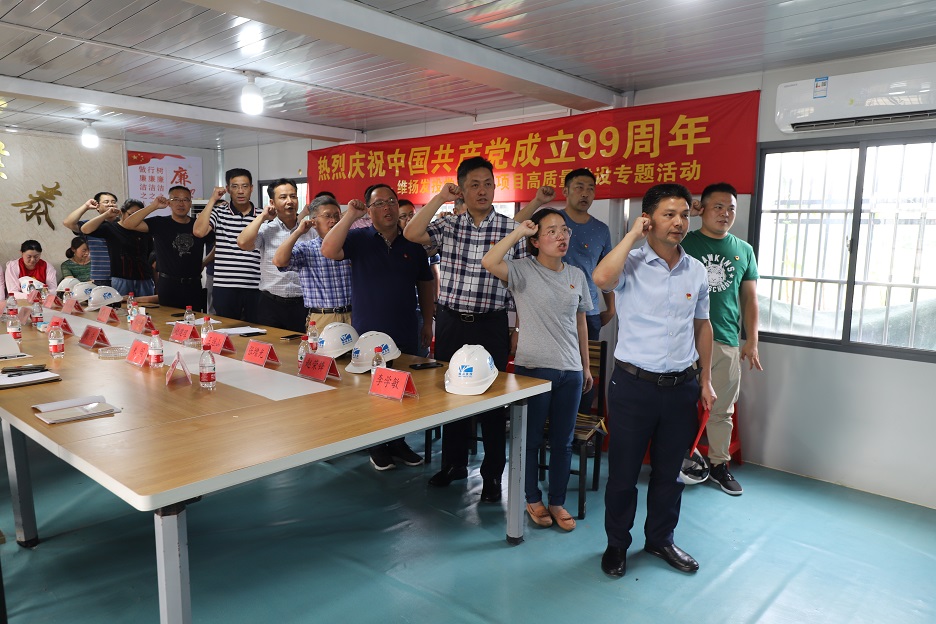 系列活動二:黨建引領項目高質量建設專題活動 6月30日下午,公司黨支部組織公司全體黨員、預備黨員、發(fā)展對象、入黨積極分子前往創(chuàng)業(yè)路(真州路-揚冶路)道路工程項目部,開展慶祝建黨99周年專題活動。 本次活動共有五項議程:一是聽取項目部匯報;二是維揚發(fā)投與華泰路橋有關負責人就創(chuàng)業(yè)路項目建設的安全生產、揚塵管控、質量控制、建設進度等方面做了詳細交流;三是由公司黨支部書記、董事長劉迪平同志帶領全體黨員重溫入黨誓詞;四是由劉迪平同志為項目部黨員代表授黨員突擊隊隊旗;五是公司黨支部書記講話。 劉迪平強調:“我們要立足項目高質量建設,強化黨建引領,帶動項目前期工作更加精心,方案設計更加精當,工程造價更加精準,項目管理更加精細,維護保養(yǎng)更加精良,讓每一個維揚發(fā)投建設項目都打上‘精品’的印記?!?/p>